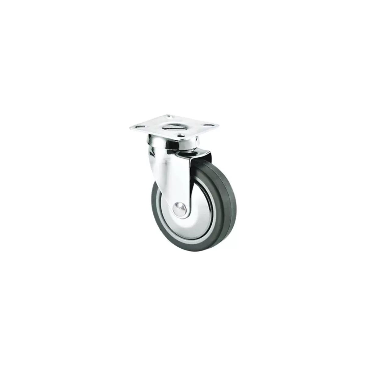 Ruota in gomma sintetica grigia flangiata in termoplastico con parafili in acciaio stampato cromato lucido.