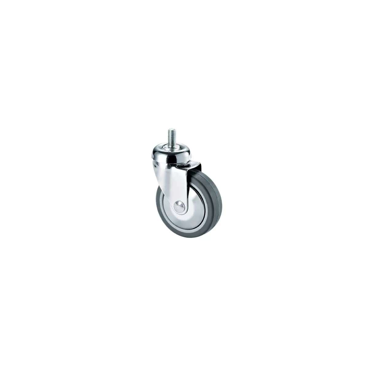 Ruota in gomma sintetica grigia flangiata in termoplastico con parafili in acciaio stampato cromato lucido.
