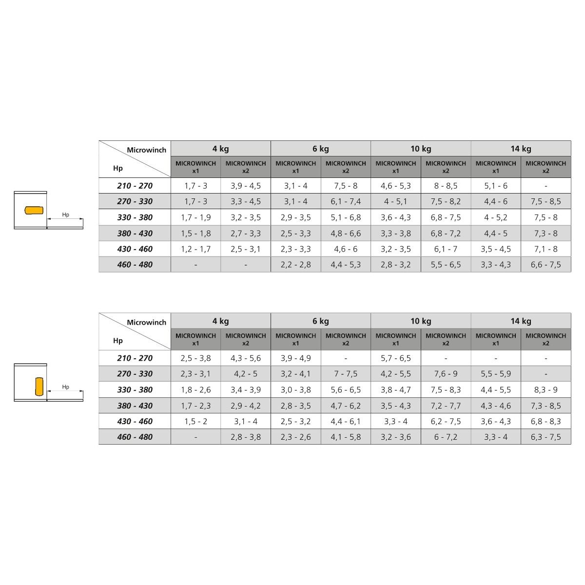 Meccanismo con forza 10 kg utilizzabile con ante da 210 mm a 480 mm di altezza (vedi tabelle di selezione).