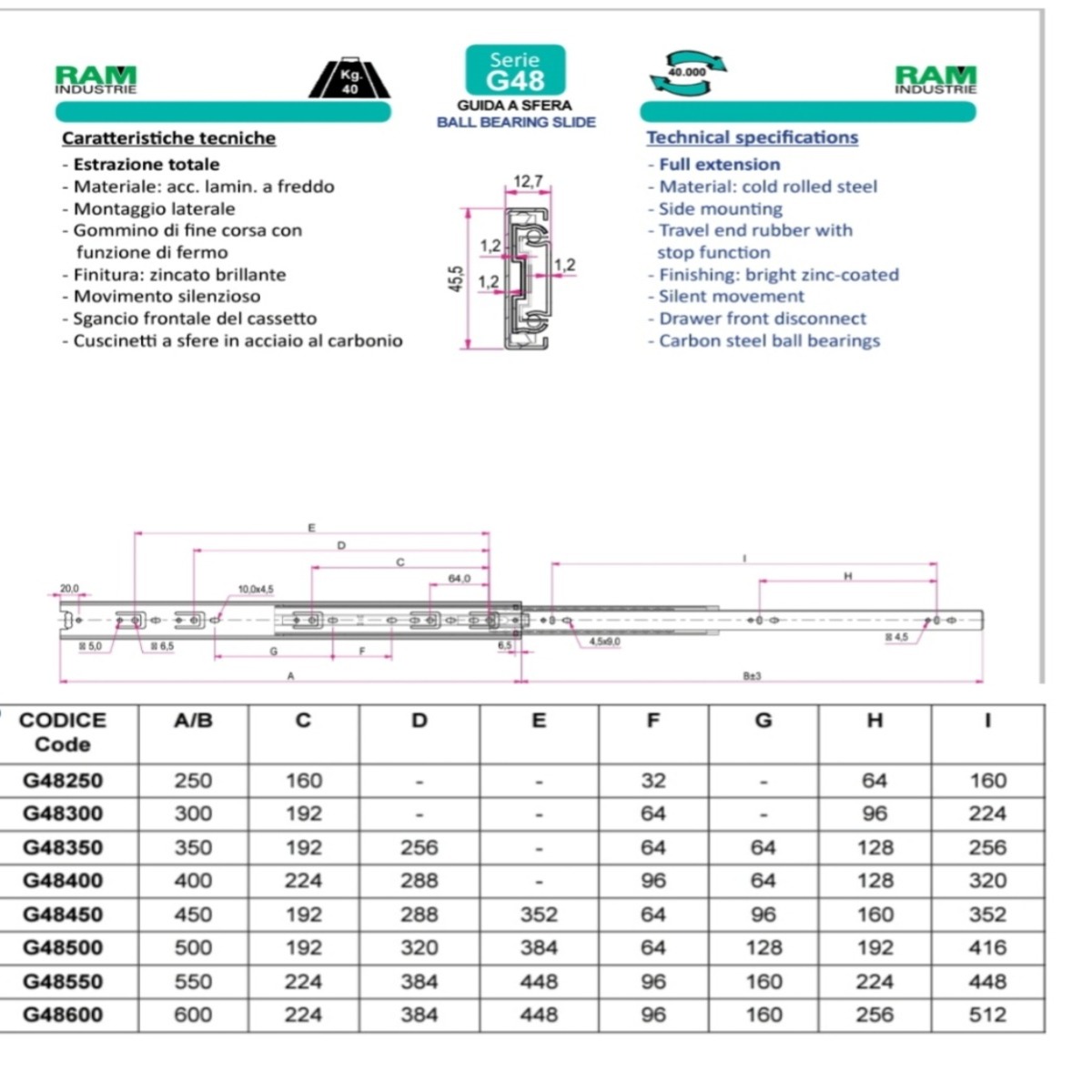 Ram Industrie - Serie G48 - Coppia Guide Telescopiche per Cassetti, portata 40 kg