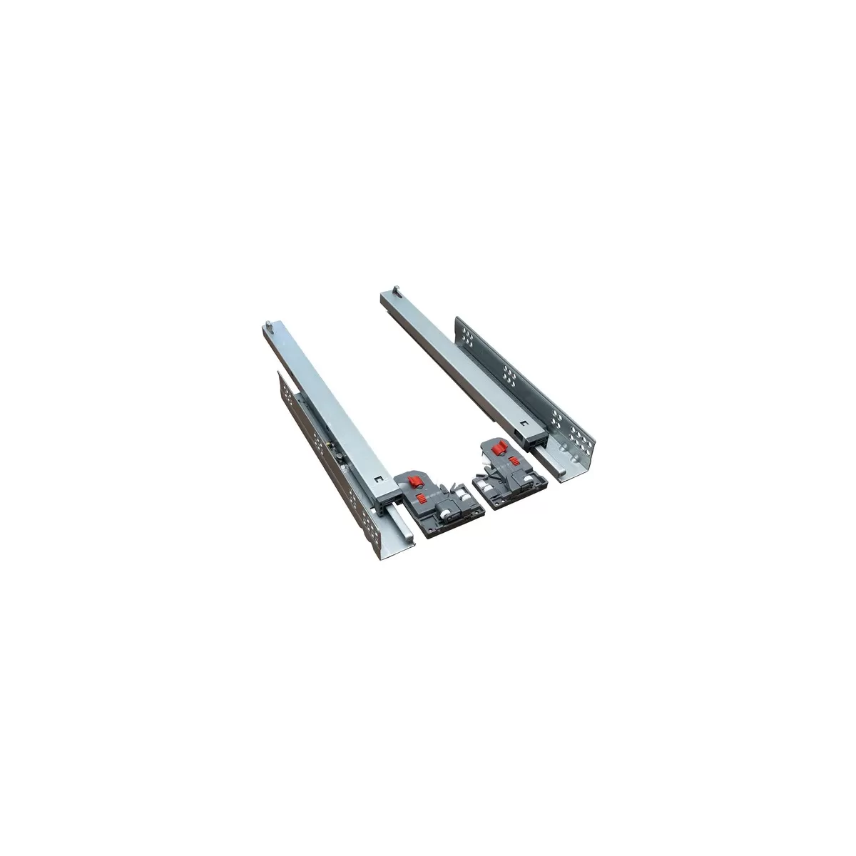 Coppia Guide invisibili per cassetti ad estrazione totale, profilo largo, chiusura ammortizzata.