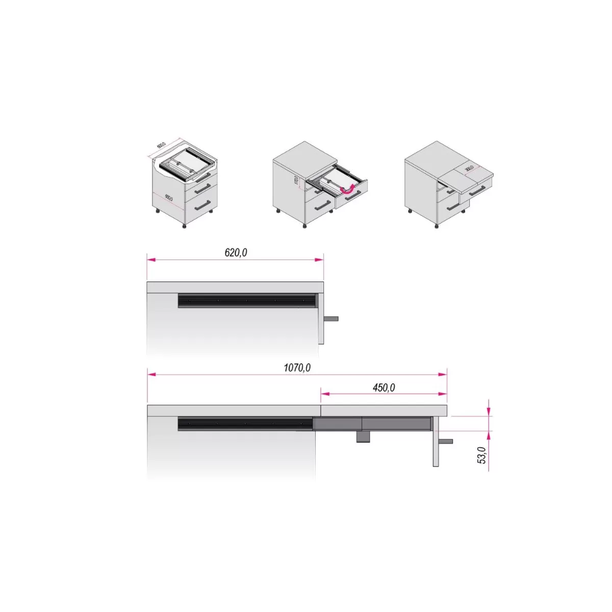 Sistema per tavolo che permette di ottenere un piano estraibile da 450 mm.