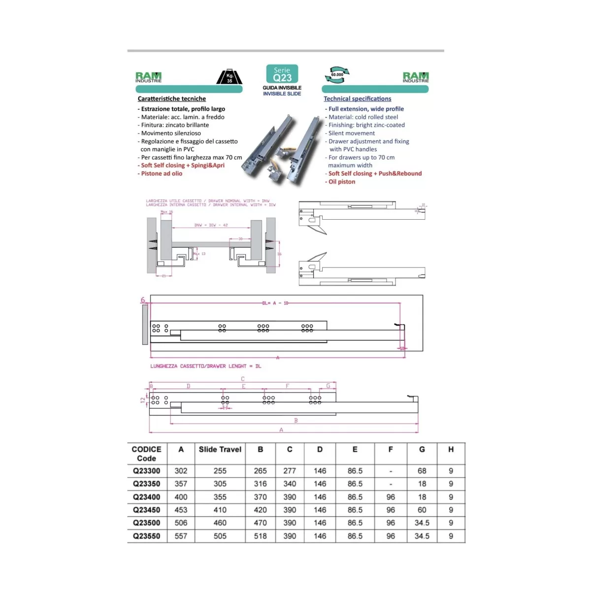 Ram Industrie GUIDE PER CASSETTI INVISIBILI Q23 ESTRAZIONE TOTALE SPINGI E APRI SOFT 400 MM - 35 KG Art.Q23400
