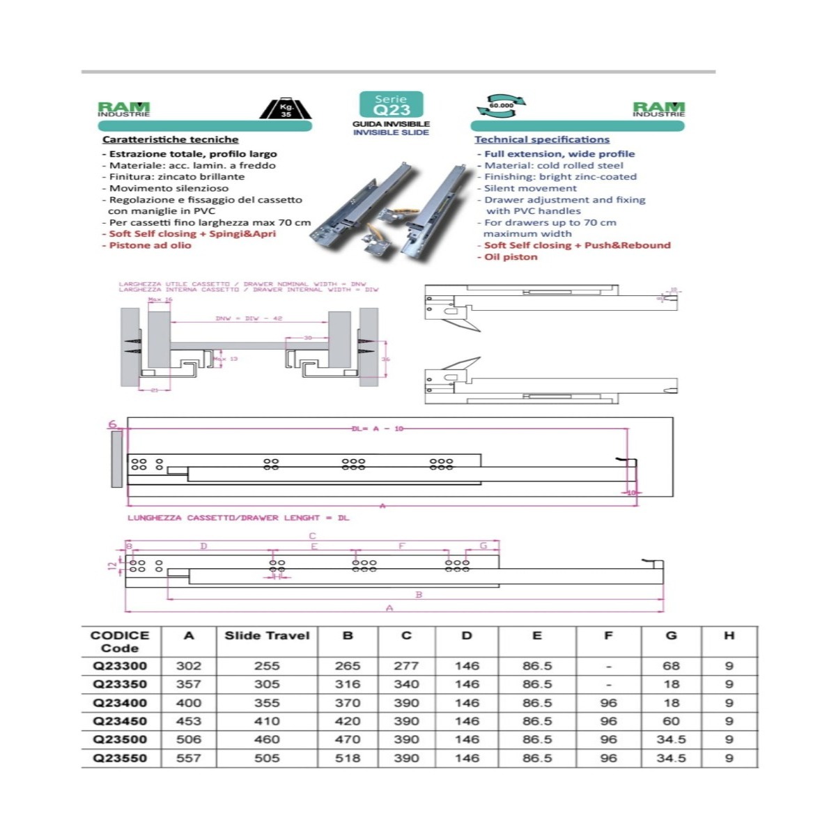 Ram Industrie GUIDE PER CASSETTI INVISIBILI Q23 ESTRAZIONE TOTALE SPINGI E APRI SOFT 550 MM - 35 KG - 35 KG Art.Q23550