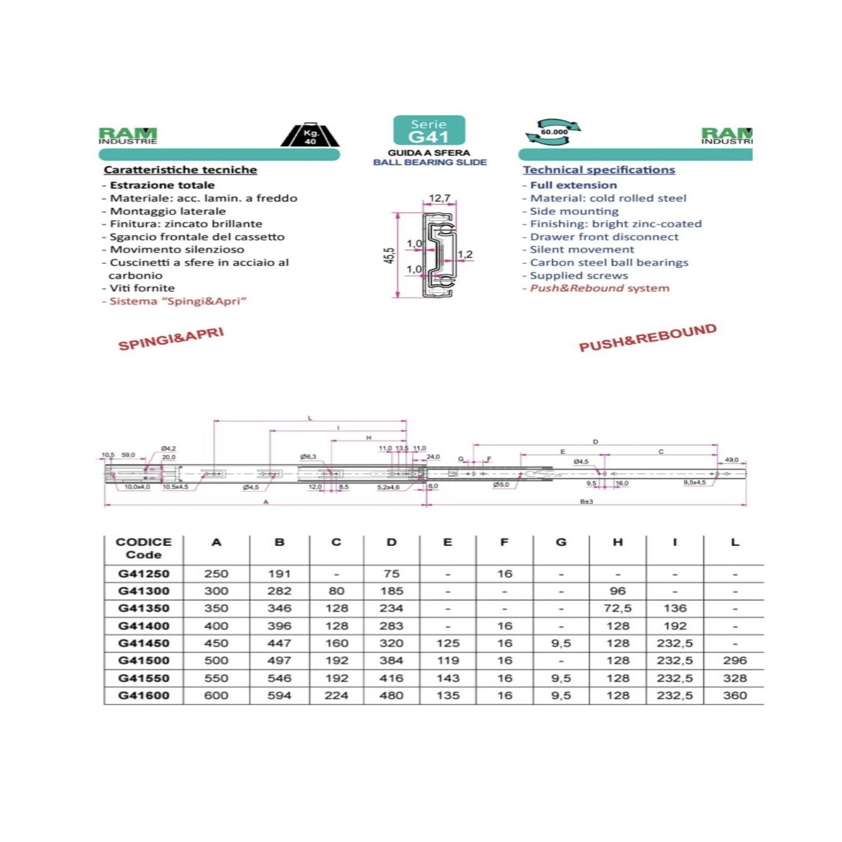 Ram Industrie GUIDE PER CASSETTI A SFERA ESTRAZIONE TOTALE SPINGI E APRI 450 MM SERIE G41 - 45 KG
