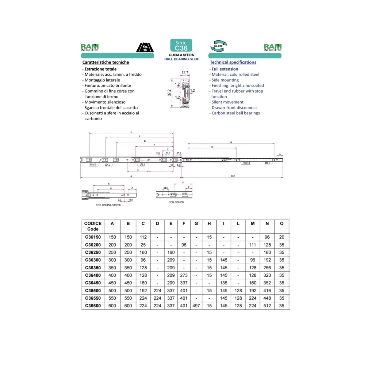 Ram Industrie GUIDE PER CASSETTI A SFERA ESTRAZIONE TOTALE STANDARD 400 MM SERIE C36 - 30 KG - Art. C36400