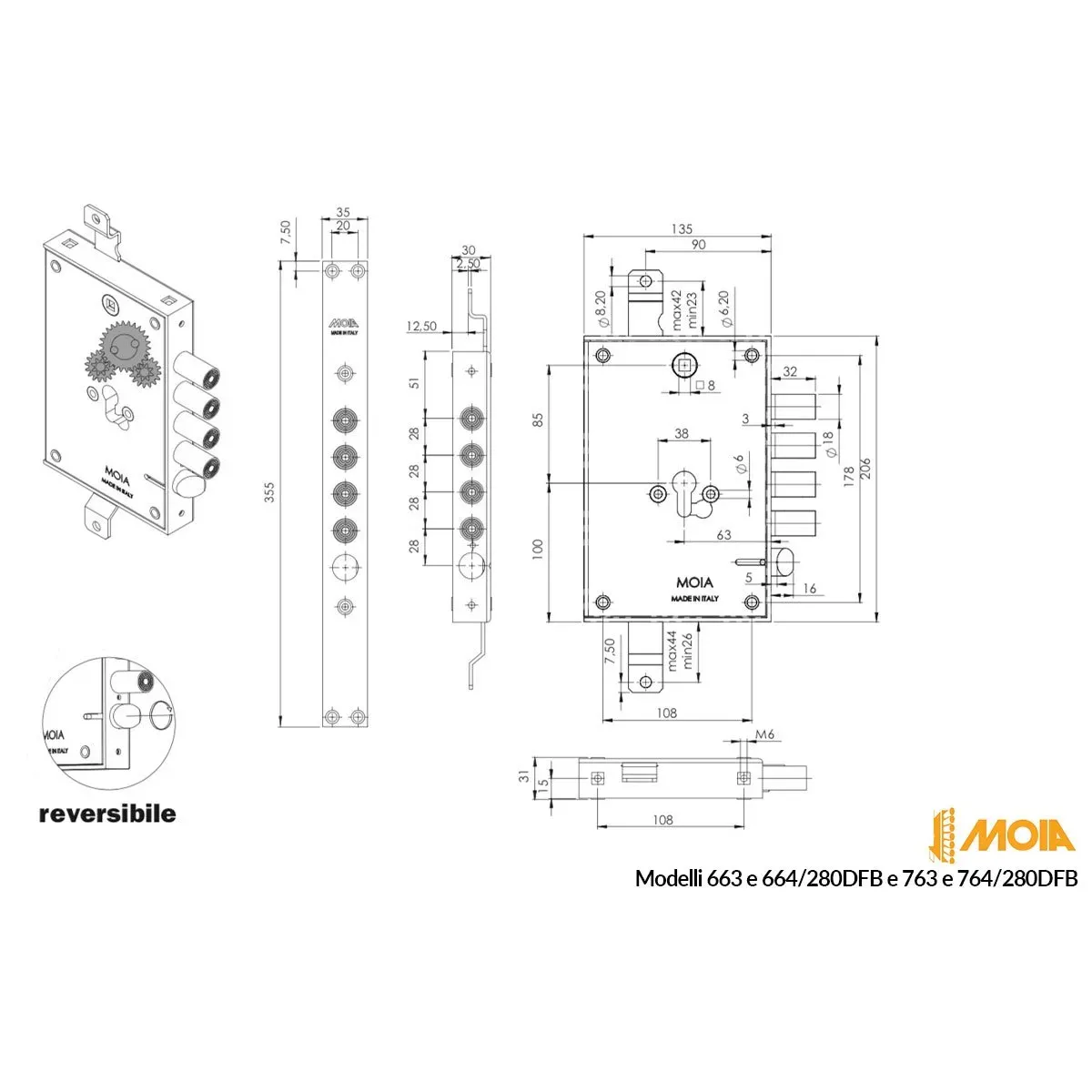 Moia SERRATURA PER PORTA BLINDATA AD INCASSO PROFILO EUROPEO ENTRATA 63 MM PASSO CHIAVISTELLI 28 MM REVERSIBILE