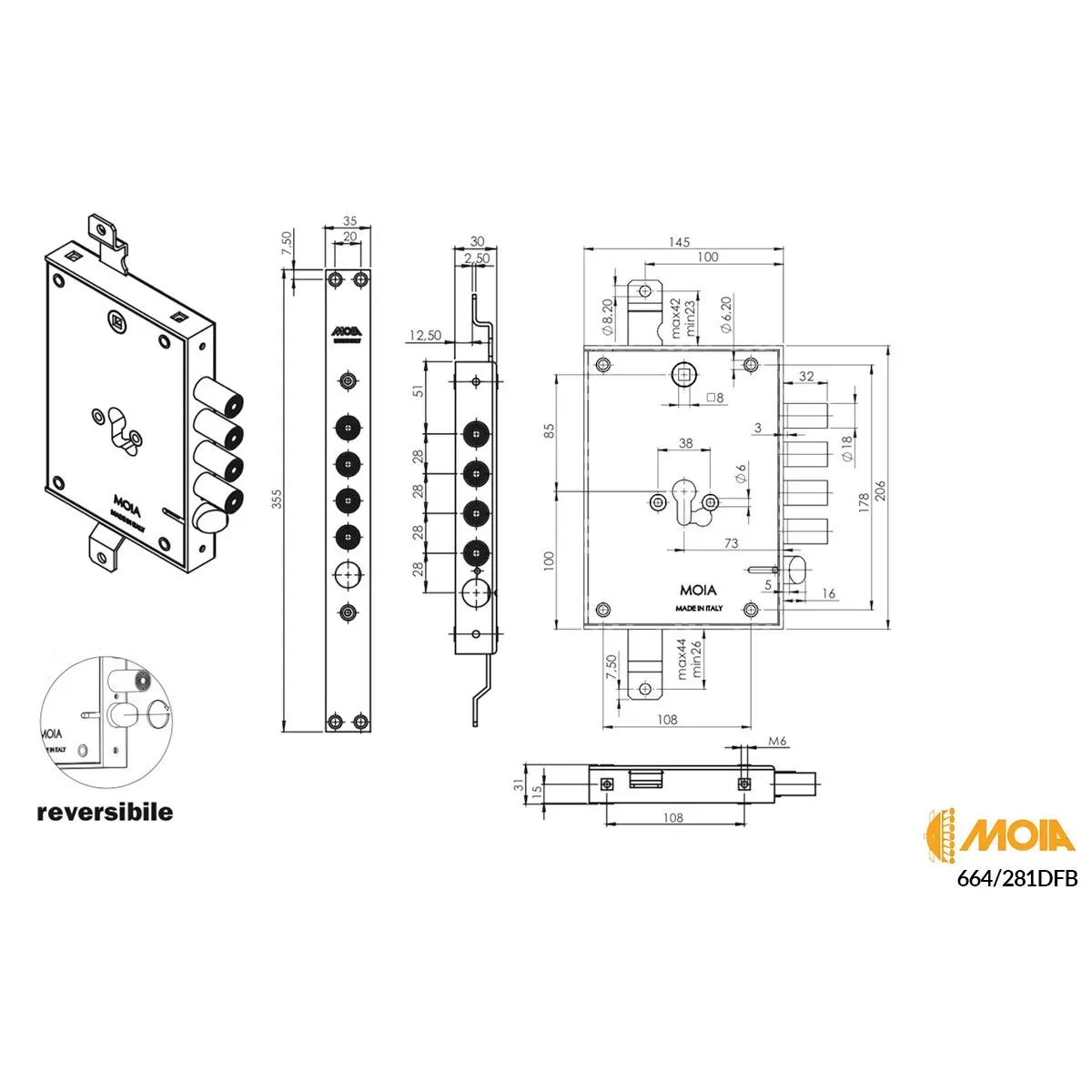 Moia SERRATURA PER PORTA BLINDATA AD INCASSO PROFILO EUROPEO ENTRATA 73 MM PASSO CHIAVISTELLI 28 MM REVERSIBILE
