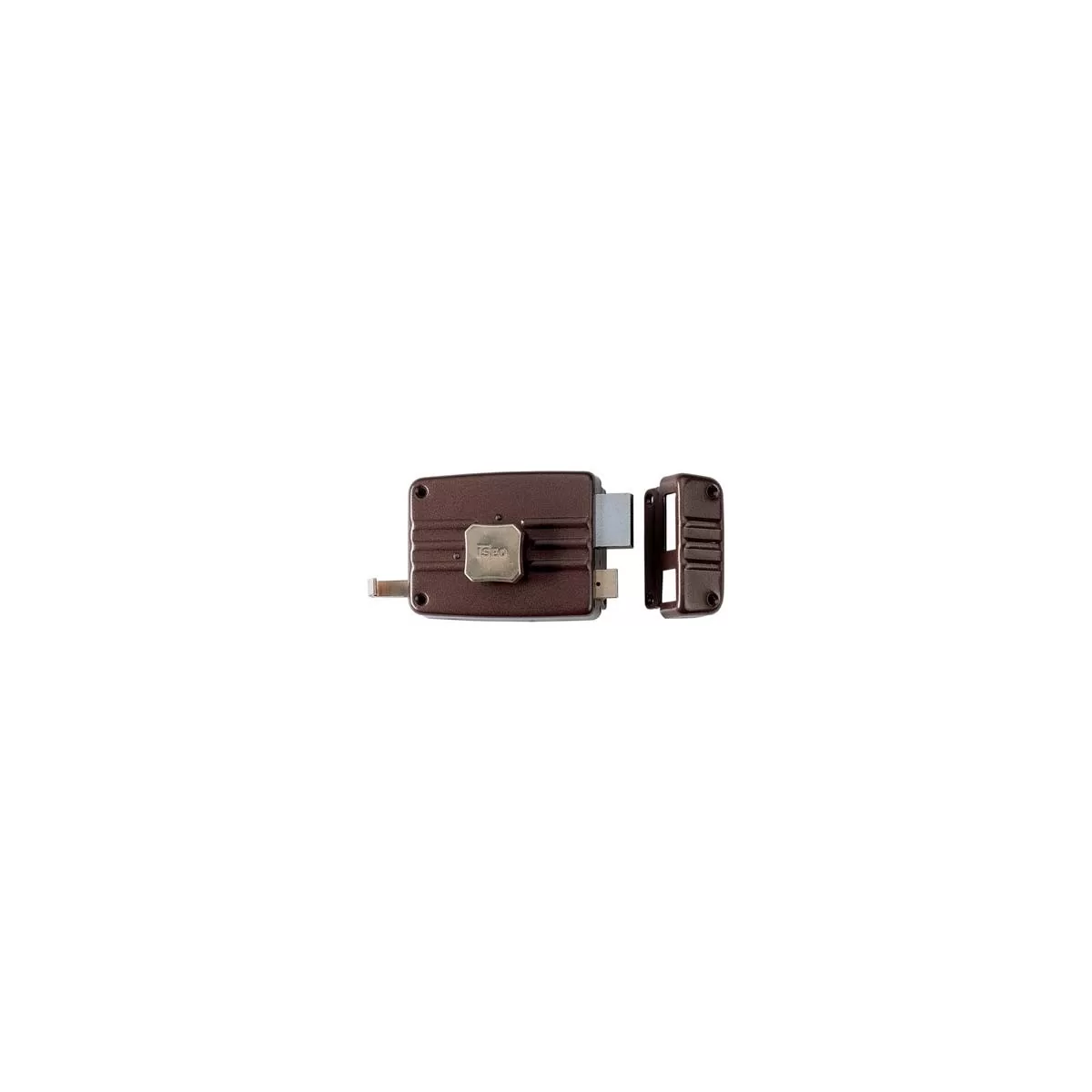 Serratura per legno ad applicare destra con pomolo interno e cilindro staccato esterno, scrocco separato con tirante interno e richiamo con chiave esterno.
