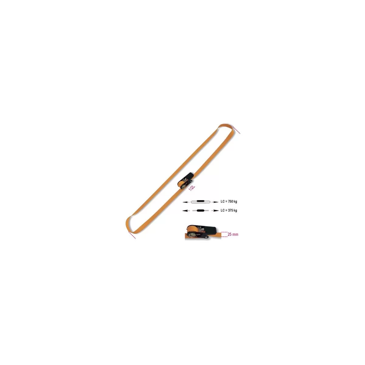Sistema di legatura ad anello, con cricchetto tenditore e nastro in poliestere ad alta tenacità da Mm. 25 di larghezza. Lunghezza Mt. 5.